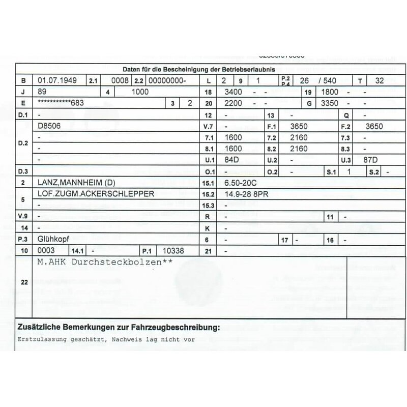 Fahrzeugbrief, Fahrzeugschein, TÜV-Bericht Lanz Bulldog D8506