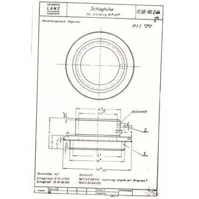 Zeichnung Montagewerkzeug: Schlaghülse 195890044, entsprechend Montagewerkzeuge aus Werkstatthandbuch für die Voll- und Halbdieseltypen D1616, D1706 u.a. Sie erhalten eine gut leserliche Kopie in DINA4 Sw. Hier im Shop ist die Qualität reduziert. Lizenzprodukt- Das LANZ Logo sowie die Wortmarken LANZ und LANZ BULLDOG sind Marken der Deere & Company