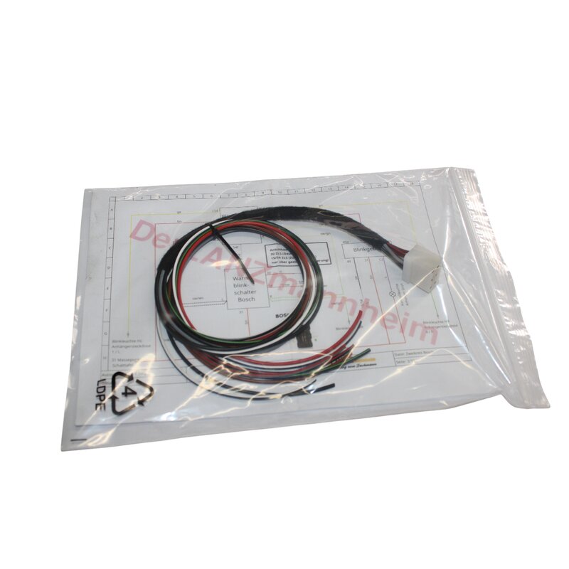 Pre-assembled connection cable for 6-pin hazard warning switch, single/double circuit, hazard warning switch part number 31787157 or 31787152 (original Bosch 0336851008), incl. connection diagram for both single and double circuit systems. The second photo shows the connection cable mounted on the hazard warning switch, this is not part of the scope of delivery and can be ordered separately: e.g. item number 31787157 or 31787152 (original Bosch 0336851008) Cable length approx. 80cm -------------------------------------------------------------------------------- Information on product safety Caution: technical component: partly heavy, sharp-edged and dirty not suitable for children under 3 years Manufacturer/eu Responsible person: Manufacturer Company name Spiekermann GmbH und Co. kg In den Erlen 8, Hilgert, 56206, de E-Mail info@derlanzmannheim.de Phone 02624948891 eu Responsible person Christian Spiekermann, In den Erlen 8, Hilgert, Rheinland-Pfalz, 56206, de E-Mail info@derlanzmannheim.de Phone 02624948891
