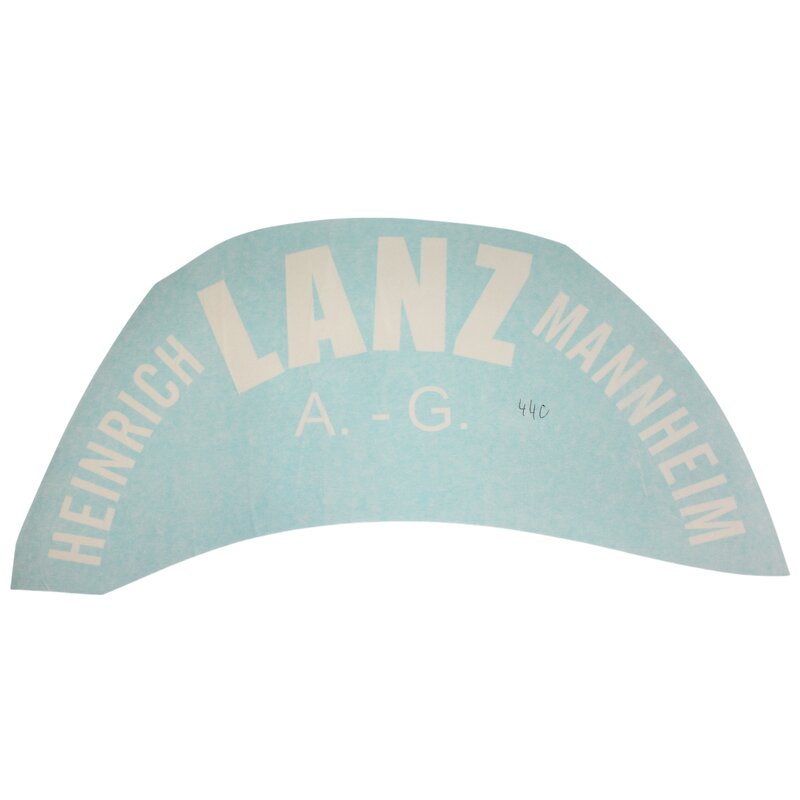 Stencil "Heinrich Lanz Mannheim ag" sulle coperture protettive. Viene incollato/fissato e può essere poi dipinto. Il carattere è strettamente basato sull'originale. Gli stencil sono realizzati ex novo per garantire la massima resa adesiva. Raggio 440 mm, adatto ai coperchi dei barili da 10 litri del dopoguerra. Prodotto su licenza - Il logo lanz e i marchi denominativi lanz e lanz bulldog sono marchi di Deere and Company