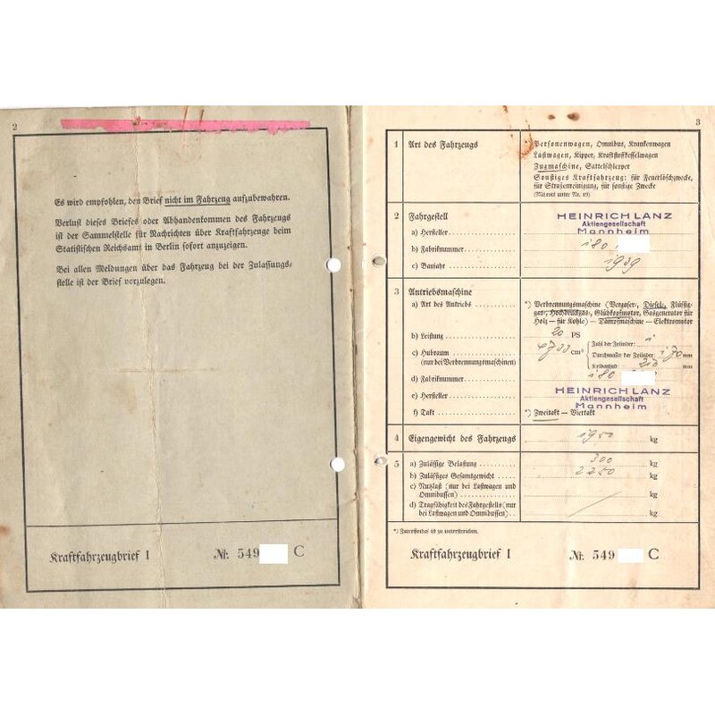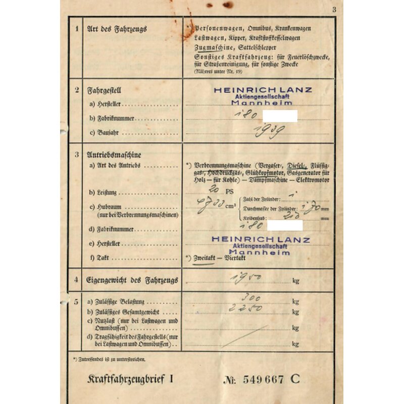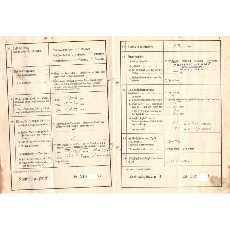 Titre du véhicule, immatriculation du véhicule, rapport du TÜV Lanz Bulldog d3506