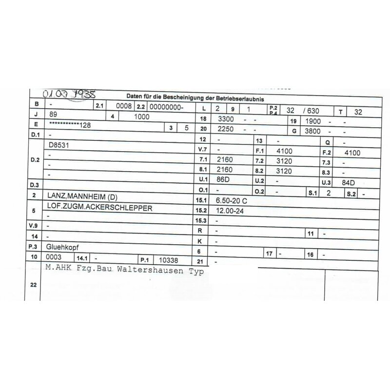 Titre du véhicule, immatriculation du véhicule, rapport du TÜV Lanz Bulldog d8531